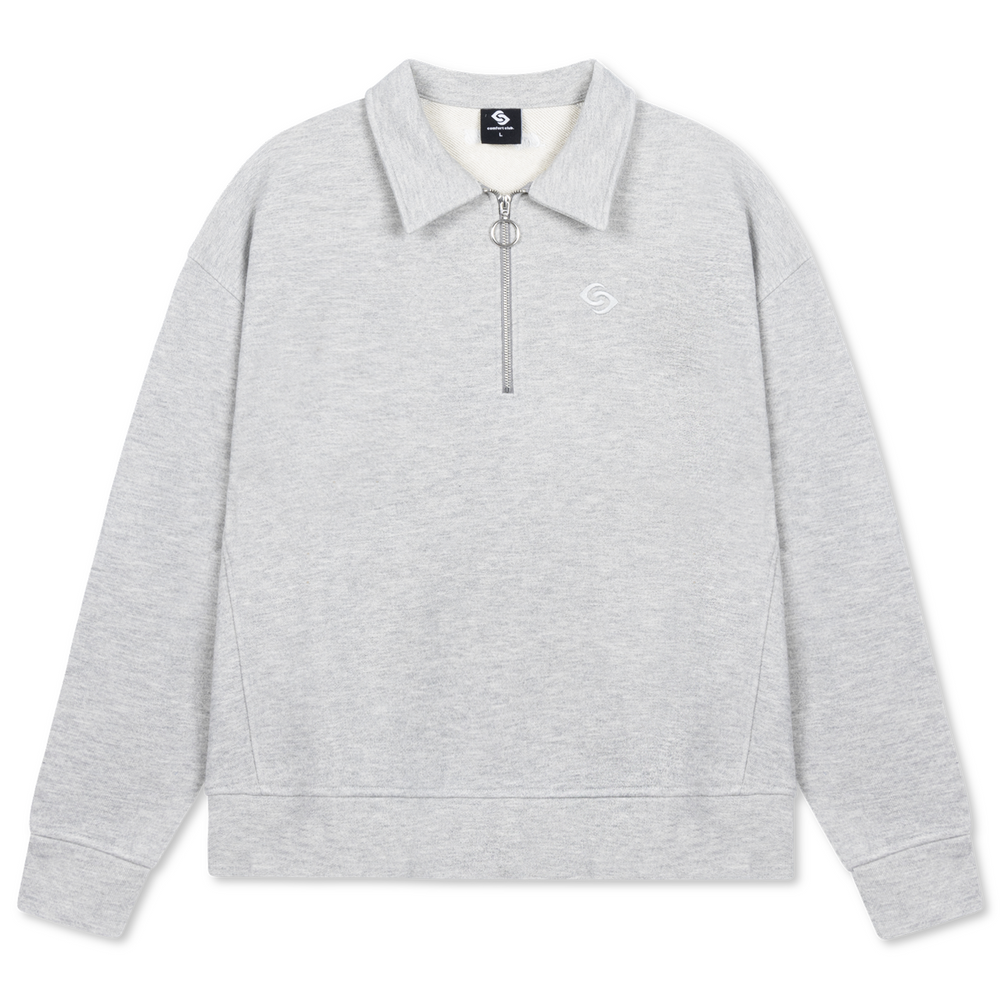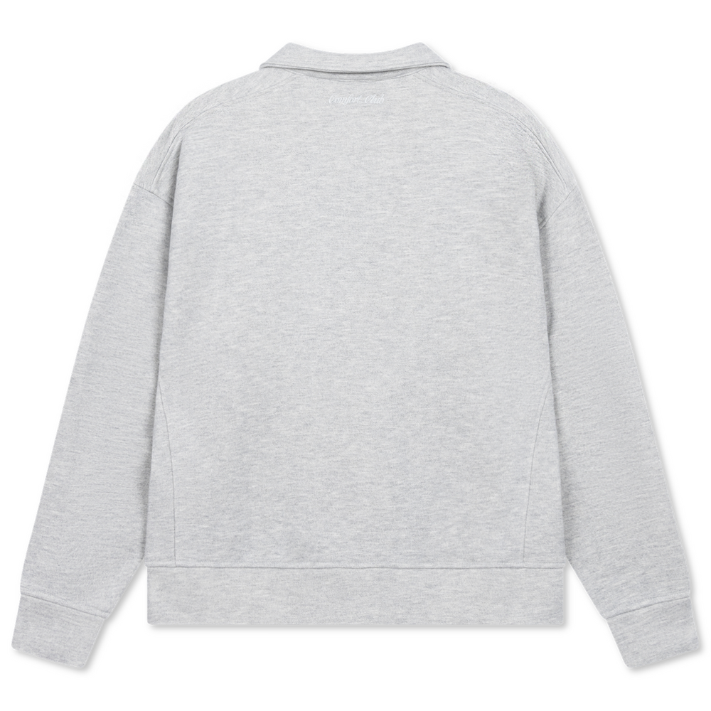 Light Gray Marl half zip with a slightly oversized fit in a heavy weight cotton. Ribbed hem & cuffs. Comfort Club logo embroidery to the chest.