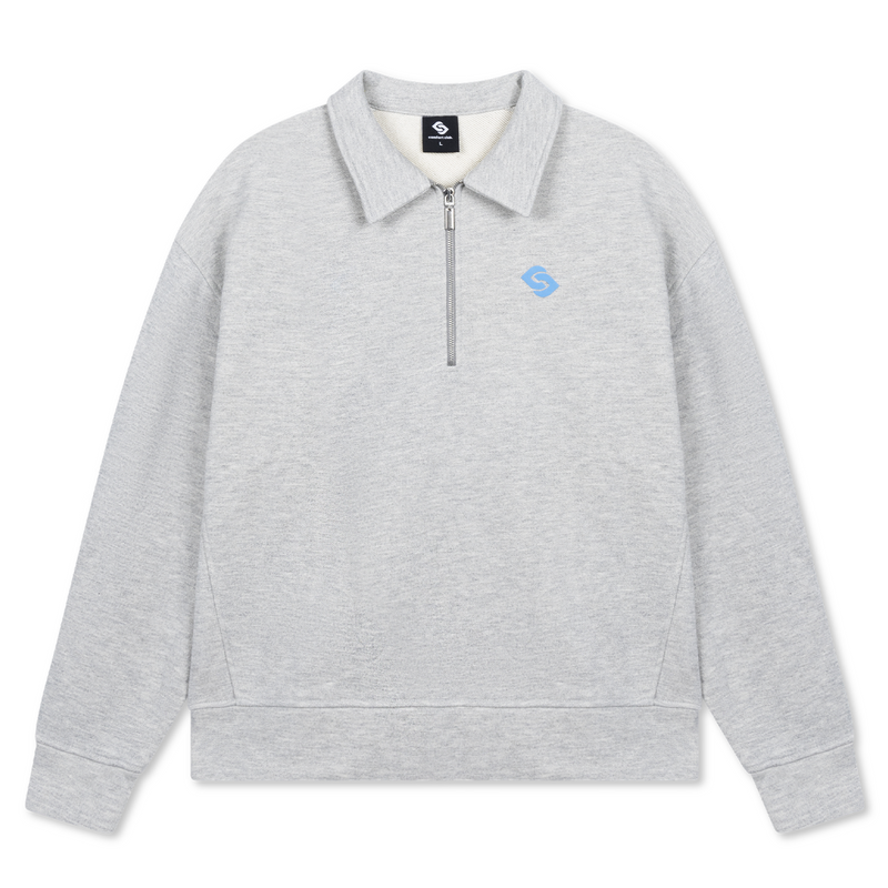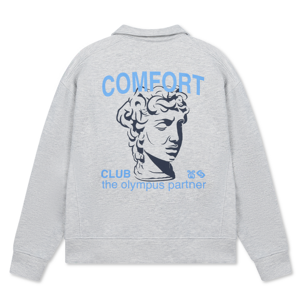 Light Gray Marl half zip with a slightly oversized fit in a heavy weight cotton. Ribbed hem & cuffs. Comfort Club Olympus print to the chest & back.