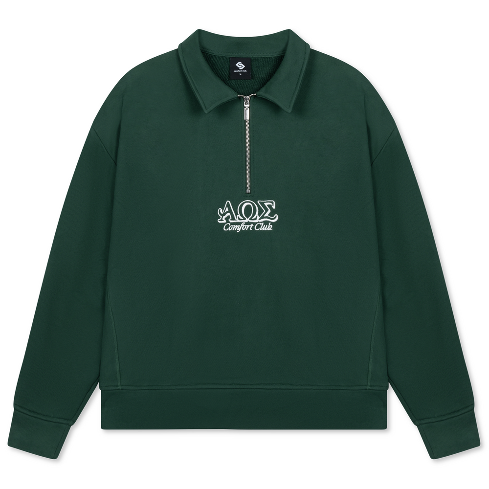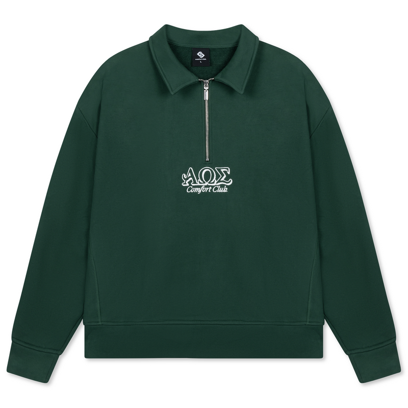 Rain Forest half zip with a slightly oversized fit in a heavy weight cotton. Ribbed hem & cuffs. Comfort Club Omega print to the chest & back.