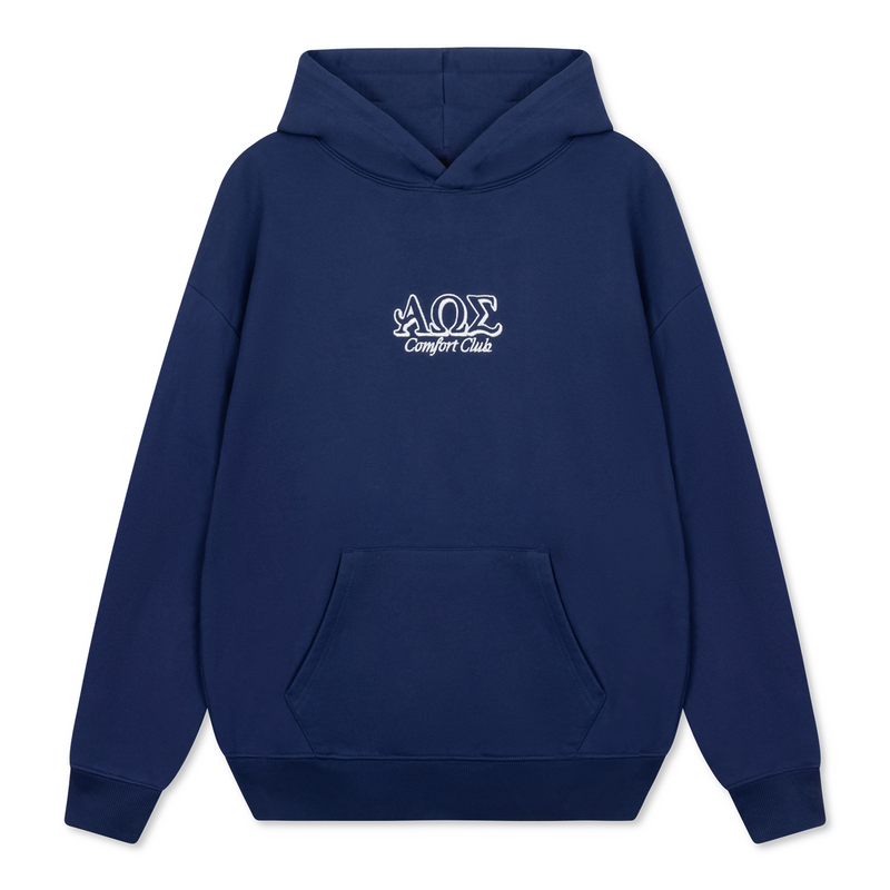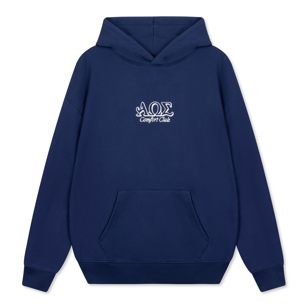 Medieval Blue hoodie with a slightly oversized fit in a heavy weight jersey cotton. Super soft, pre-shrunk and piece dyed for the ultimate jersey. Ribbed hem & cuffs. Comfort Club Omega embroidery to the chest & back.