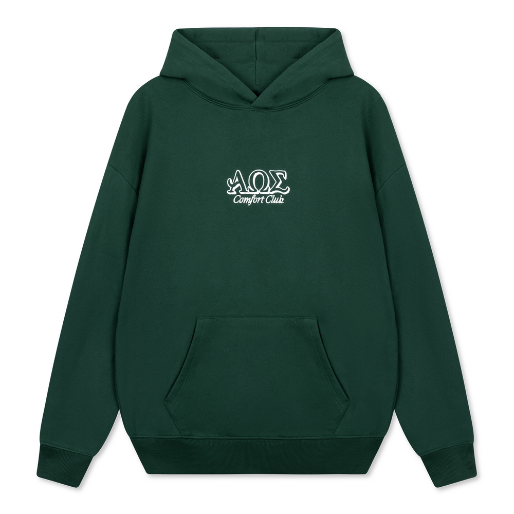 Rain Forest hoodie with a slightly oversized fit in a heavy weight jersey cotton. Super soft, pre-shrunk and piece dyed for the ultimate jersey. Ribbed hem & cuffs. Comfort Club Omega embroidery to the chest & back.
