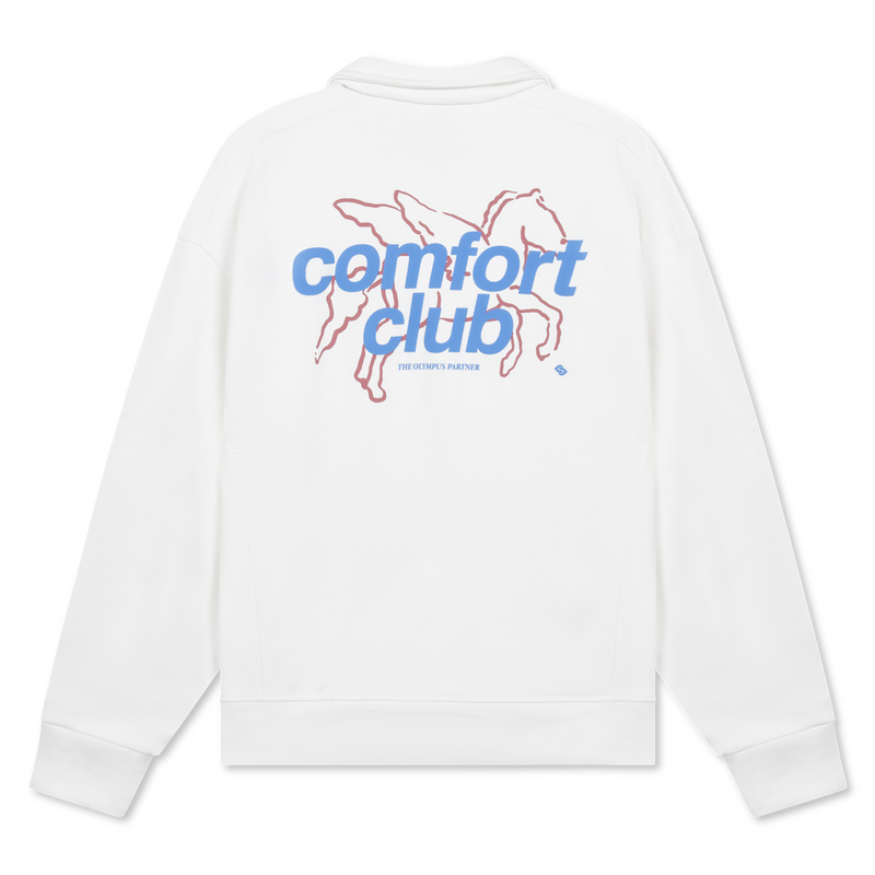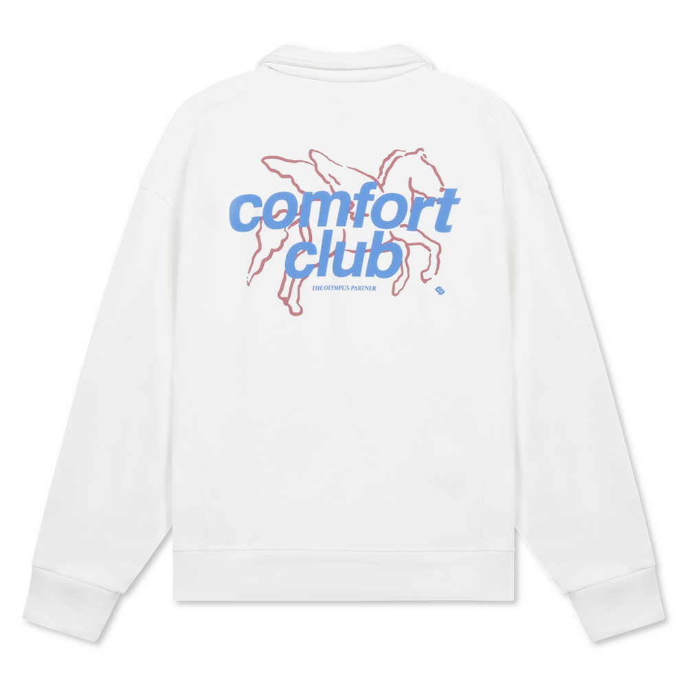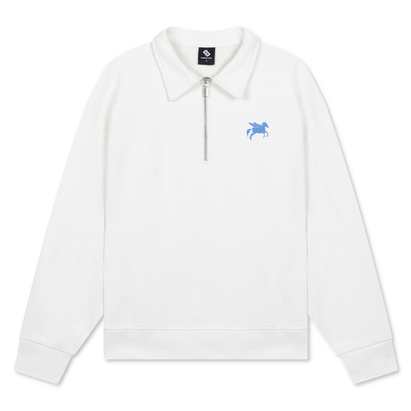 Marshmallow half zip with a slightly oversized fit in a heavy weight cotton. Ribbed hem & cuffs. Comfort Club Pegasus print to the chest & back.